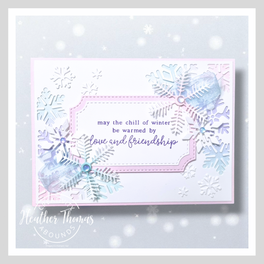 The Snowflake Kisses dies have this really cool cut in element, which I used on the corners of the card here, can you see it? I die cut two from a standard mat of cardstock, and then overlaid it onto another standard mat, which I had used my inks and blending brushes to sponge on some super pale colours.