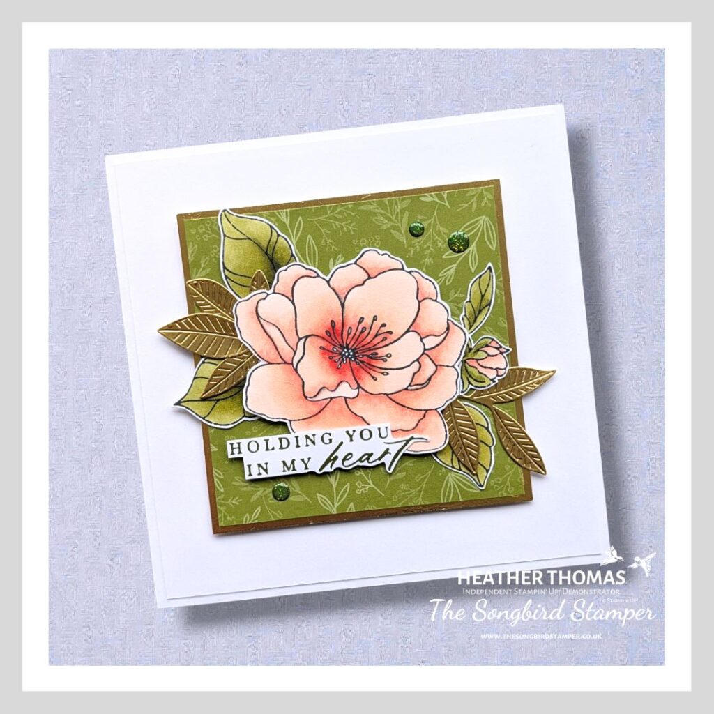 I used the gorgeous new stamp set Simply Beautiful for this card, I just love the large images and how they create a really striking focal point for the card. Add some colouring, with Calypso Coral and Petal Pink blends for the flower and Mossy Meadow and Old Olive for the leaves, and I was in my happy place!!